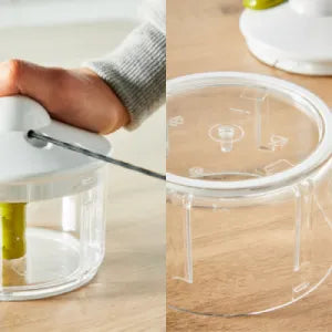Attach the blades. Add your ingredient. Close the lid. Pull the handle… One, two, three times. The more you pull, the finer you chop!