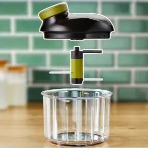 Attach the blade. Add your ingredient. Close the lid. Pull the handle… One, two, three times. The more you pull, the finer you chop!