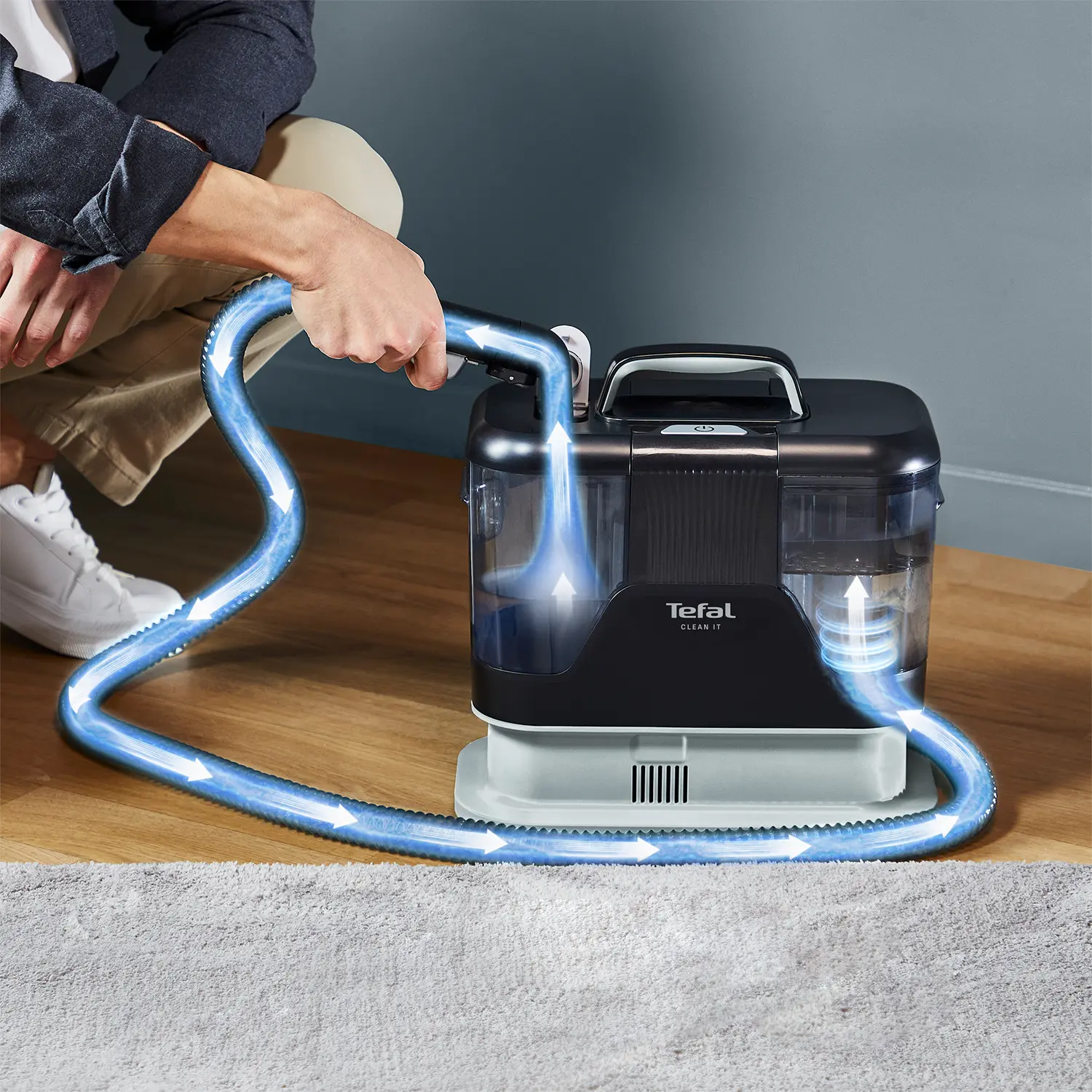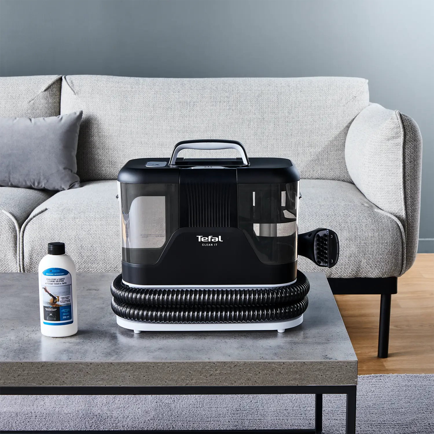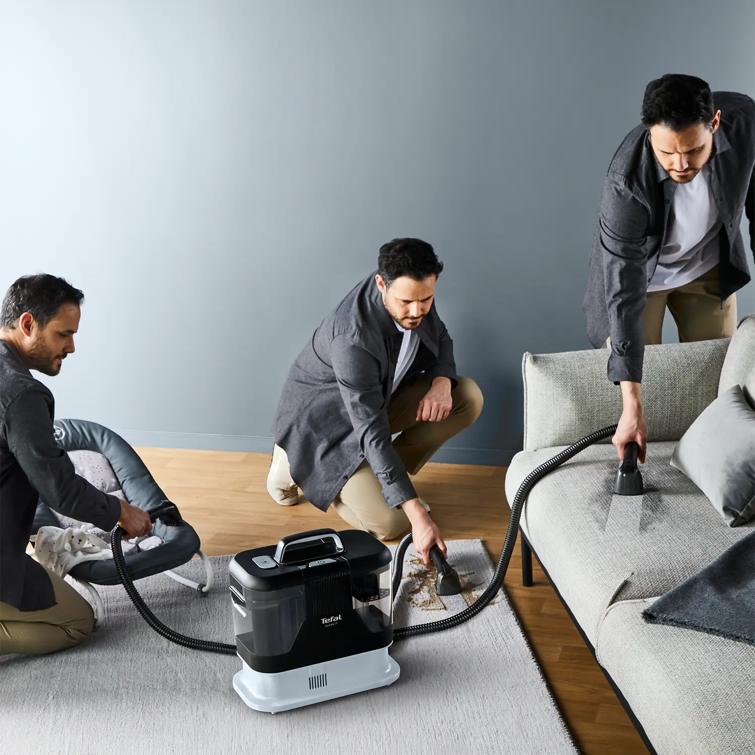 Quick and efficient, the portable carpet cleaner offers reliable multi-cleaning action with interchangeable heads to tackle carpets, sofas, car interiors, upholstery, mattresses, and more. Equipped with a full range of enhanced features for ultimate convenience, it's the perfect day-to-day cleaning appliance for maintaining a spotless home effortlessly. Discover Tefal Clean It for a cleaner and more comfortable living space.