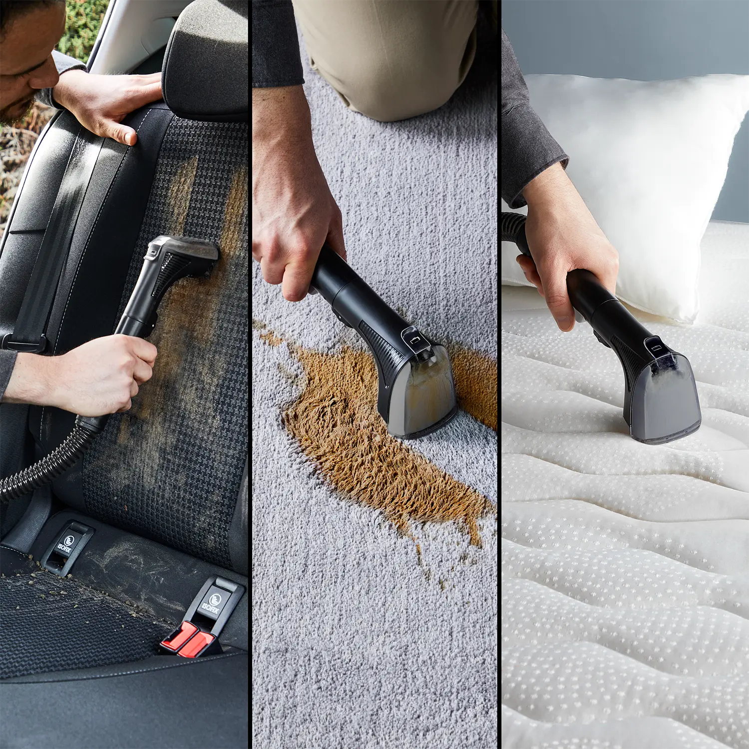 Interchangeable cleaning heads for carpets, sofas, car interiors, upholstery and more, with easy access everywhere and a full accessory kit.